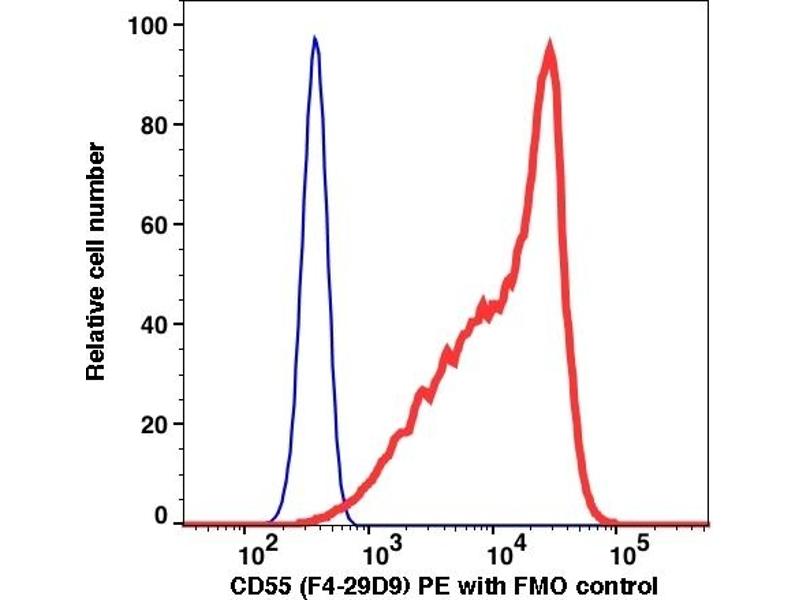The clone F4-29D9 binds with a single chain 70 kDa glycoprotein and identified as CD55 (also known as decay accelerating factor, DAF). CD55 is widely expressed on cells throughout the body including leukocytes, erythrocytes, epithelium, endothelium, and fibroblasts. It is a Glycosyl phosphatidylinositol anchored (GPI-anchored) protein and inhibits autologous complement cascade activation. CD55 also serves as receptor for CD97, echovirus and Coxsackie B virus. Anticd55 is a useful marker for the diagnosis of paroxysmal nocturnal hemoglobinuria (PNH).