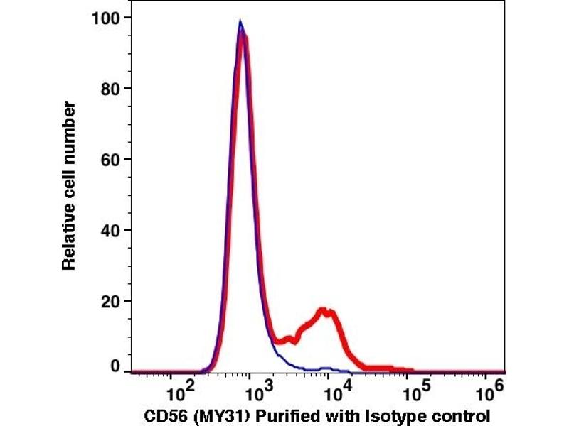 Clone MY31, a mouse antibody, binds to the human 140- kDa glycoprotein, an isoform of neural cell adhesion molecule (NCAM) known as CD56. CD56 and CD16 expressing lymphocytes are primarily considered as human NK cells and NK-T cells. A subset of CD56+ NK cells play a unique functional role in the innate immune response as the primary source of NK cell-derived immunoregulatory cytokines, regulated in part by differential monokine production. CD56 is also expressed in normal and neoplastic human neuroendocrine tissues, certain large granular lymphocyte (LGL) leukemias, small-cell lung carcinomas, neuronal derived tumors, myelomas, and myeloid leukemias. Increased CD56 + lymphocyte subsets in peripheral blood has a significant predictive or prognostic factor in metastatic breast cancer.