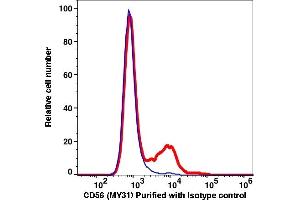 Clone MY31, a mouse antibody, binds to the human 140- kDa glycoprotein, an isoform of neural cell adhesion molecule (NCAM) known as CD56. CD56 and CD16 expressing lymphocytes are primarily considered as human NK cells and NK-T cells. A subset of CD56+ NK cells play a unique functional role in the innate immune response as the primary source of NK cell-derived immunoregulatory cytokines, regulated in part by differential monokine production. CD56 is also expressed in normal and neoplastic human neuroendocrine tissues, certain large granular lymphocyte (LGL) leukemias, small-cell lung carcinomas, neuronal derived tumors, myelomas, and myeloid leukemias. Increased CD56 + lymphocyte subsets in peripheral blood has a significant predictive or prognostic factor in metastatic breast cancer.