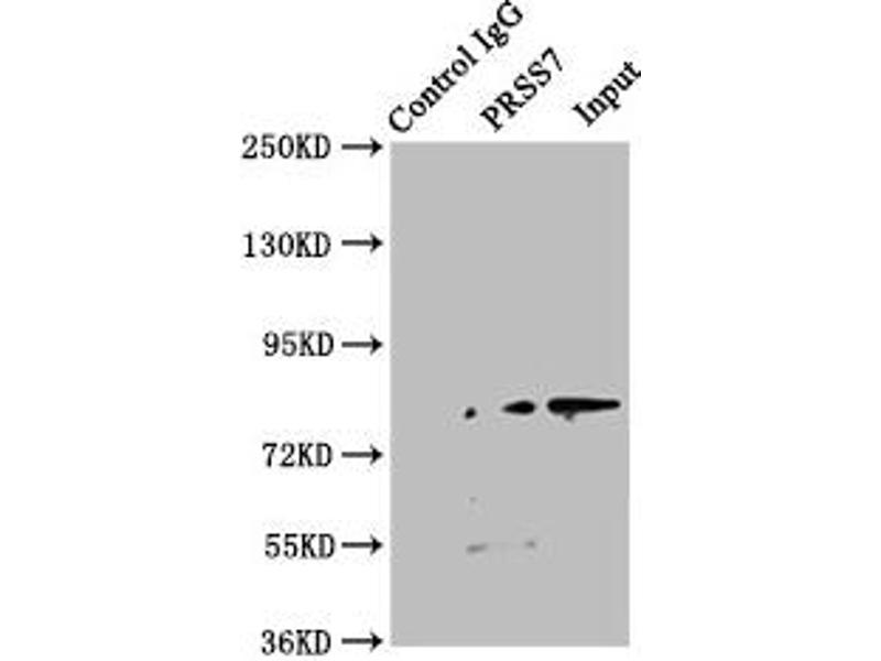 Aliases: PRSS 7 antibody, PRSS7 antibody, Enterokinase antibody, Enterokinase catalytic subunit antibody, Enteropeptidase antibody, Enteropeptidase catalytic light chain antibody, Enteropeptidase non catalytic heavy chain antibody, ENTK antibody, ENTK_HUMAN antibody, PROENTEROKINASE antibody, protease, serine, 7 (enterokinase) antibody, PRSS7 antibody, Serine protease 7 antibody, TMPRSS15 antibody, Transmembrane protease serine 15 antibody