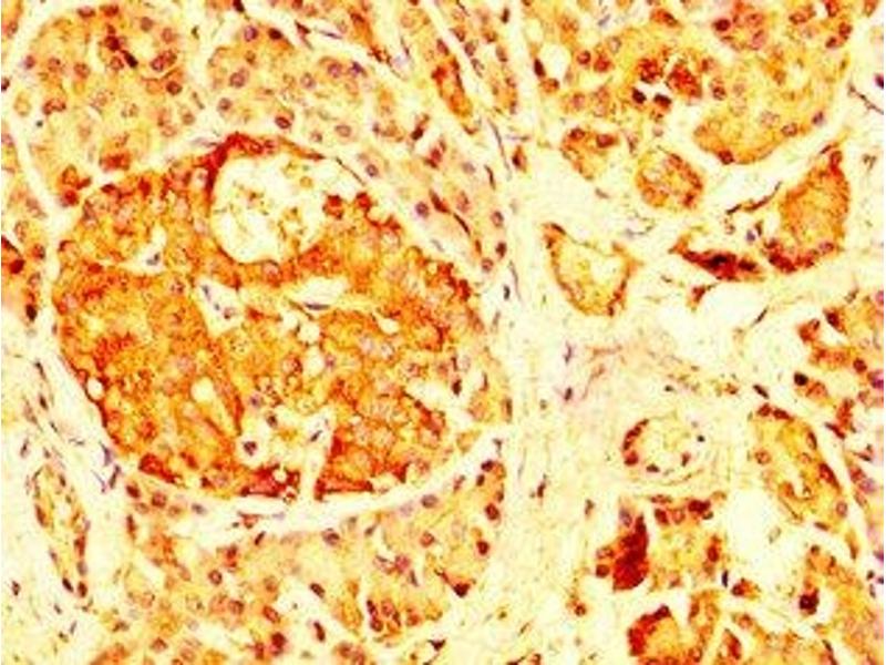 Background: The small GTPases Rab are key regulators of intracellular membrane trafficking, from the formation of transport vesicles to their fusion with membranes. Rabs cycle between an inactive GDP-bound form and an active GTP-bound form that is able to recruit to membranes different set of downstream effectors directly responsible for vesicle formation, movement, tethering and fusion. Mediates transport of ADRA2A and ADRA2B from the Golgi to the cell membrane. Plays a role in the maturation of zymogenic granules and in pepsinogen secretion in the stomach. Plays a role in the secretion of amylase from acinar granules in the parotid gland.