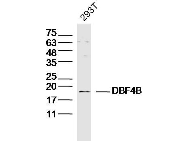 Background: DBF4B is a regulatory subunit for CDC7, a serine-threonine kinase which links cell cycle regulation to genome duplication. The complex CDC7-DBF4B selectively phosphorylates the MCM2 subunit at 'Ser-40' and then is involved in regulating the initiation of DNA replication during cell cycle. DBF4B localizes to the nucleus and its expression is cell cycle-regulated.