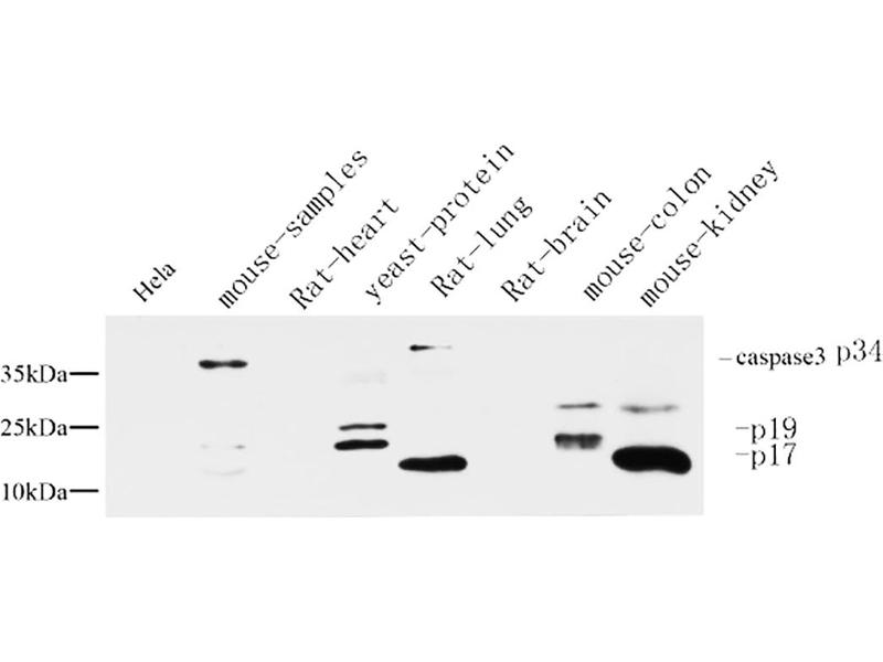 - Rabbit Anti-Cleaved-Caspase-3 p17 (D175) Polyclonal Antibody,CASP3, CPP32, Caspase-3, CASP-3, Apopain, Cysteine protease CPP32, CPP-32, Protein Yama, SREBP cleavage activity 1, SCA-1,CASP3 encodes caspase 3 which is a member of the cysteine-aspartic acid protease (caspase) family. Sequential activation of caspases plays a central role in the execution-phase of cell apoptosis. Caspases exist as inactive proenzymes which undergo proteolytic processing at conserved aspartic residues to produce two subunits, large and small, that dimerize to form the active enzyme. Caspase 3 cleaves and activates caspases 6, 7 and 9, and caspase 3 itself is processed by caspases 8, 9 and 10. It is the predominant caspase involved in the cleavage of amyloid-beta 4A precursor protein, which is associated with neuronal death in Alzheimer's disease. Alternative splicing of CASP3 results in two transcript variants that encode the same protein.,Caspase-3