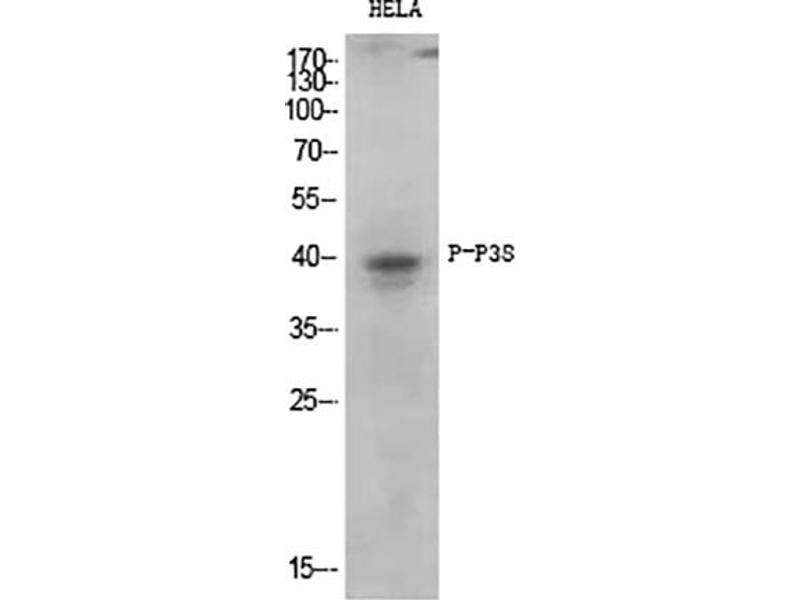 Rabbit Anti-p38 (phospho Thr180/Y182) Polyclonal Antibody,MAPK14, CSBP, CSBP1, CSBP2, CSPB1, MXI2, SAPK2A, Mitogen-activated protein kinase 14, MAP kinase 14, MAPK 14, Cytokine suppressive anti-inflammatory drug-binding protein, CSAID-binding protein, CSBP, MAP kinase MXI2, MAX-interacting protein,Mitogen-activated protein kinase 14 encoded by MAPK14 is a member of the MAP kinase family. MAP kinases act as an integration point for multiple biochemical signals, and are involved in a wide variety of cellular processes such as proliferation, differentiation, transcription regulation and development. Mitogen-activated protein kinase 14 is activated by various environmental stresses and proinflammatory cytokines. The activation requires its phosphorylation by MAP kinase kinases (MKKs), or its autophosphorylation triggered by the interaction of MAP3K7IP1/TAB1 protein with mitogen-activated protein kinase 14.The substrates of mitogen-activated protein kinase 14 include transcription regulator ATF2, MEF2C, and MAX, cell cycle regulator CDC25B, and tumor suppressor p53, which suggest the roles of mitogen-activated protein kinase 14 in stress related transcription and cell cycle regulation, as well as in genotoxic stress response. Four alternatively spliced transcript variants of MAPK14 encoding distinct isoforms have been reported.,Mitogen-activated protein kinase 14