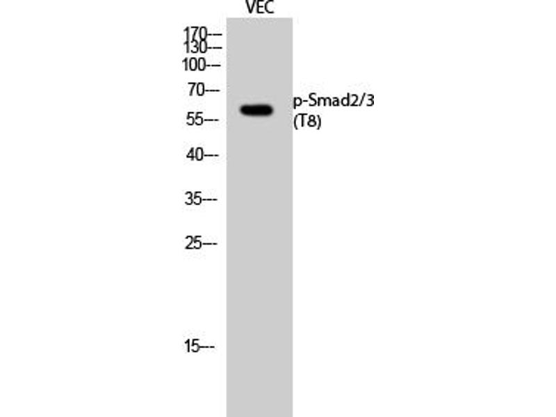 Rabbit Anti-Smad2/3 (phospho Thr8) Polyclonal Antibody,SMAD2, MADH2, MADR2, Mothers against decapentaplegic homolog 2, MAD homolog 2, Mothers against DPP homolog 2, JV18-1, Mad-related protein 2, hMAD-2, SMAD family member 2, SMAD 2, Smad2, hSMAD2, SMAD3, MADH3, Mothers against decapentaplegic,SMAD family member 2 encoded by SMAD2 belongs to the SMAD, a family of proteins similar to the gene products of the Drosophila gene 'mothers against decapentaplegic' (Mad) and the C. elegans gene Sma. SMAD proteins are signal transducers and transcriptional modulators that mediate multiple signaling pathways. This protein mediates the signal of the transforming growth factor (TGF)-beta, and thus regulates multiple cellular processes, such as cell proliferation, apoptosis, and differentiation. This protein is recruited to the TGF-beta receptors through its interaction with the SMAD anchor for receptor activation (SARA) protein. In response to TGF-beta signal, this protein is phosphorylated by the TGF-beta receptors. The phosphorylation induces the dissociation of this protein with SARA and the association with the family member SMAD4. The association with SMAD4 is important for the translocation of this protein into the nucleus, where it binds to target promoters and forms a transcription repressor complex with other cofactors. This protein can also be phosphorylated by activin type 1 receptor kinase, and mediates the signal from the activin. Alternatively spliced transcript variants have been observed for SMAD2.,Mothers against decapentaplegic homolog 2