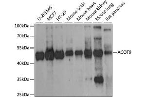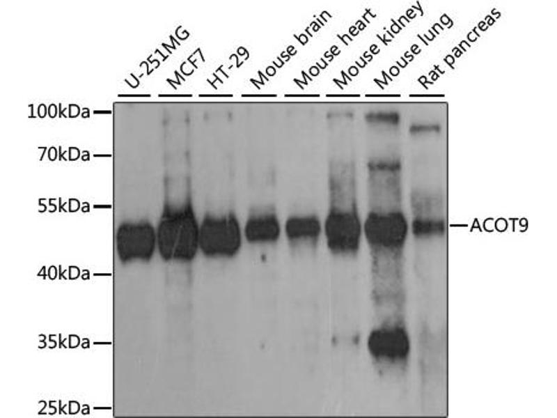 The protein encoded by this gene is a mitochondrial acyl-CoA thioesterase of unknown function. Two transcript variants encoding different isoforms have been found for this gene.,ACOT9,ACATE2,CGI-16,MT-ACT48,MTACT48,Cancer,Signal Transduction,Endocrine & Metabolism,Mitochondrial metabolism,Mitochondrial markers,Lipid Metabolism,ACOT9