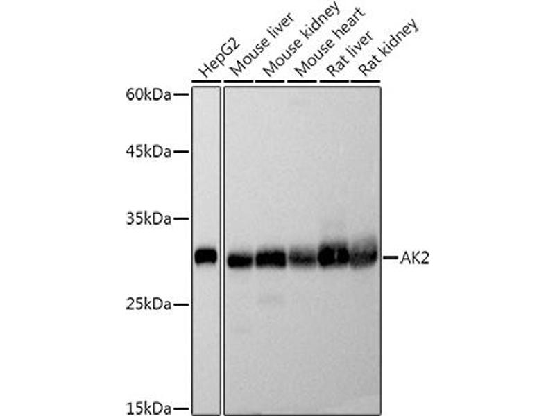 Adenylate kinases are involved in regulating the adenine nucleotide composition within a cell by catalyzing the reversible transfer of phosphate groups among adenine nucleotides. Three isozymes of adenylate kinase, namely 1, 2, and 3, have been identified in vertebrates, this gene encodes isozyme 2. Expression of these isozymes is tissue-specific and developmentally regulated. Isozyme 2 is localized in the mitochondrial intermembrane space and may play a role in apoptosis. Mutations in this gene are the cause of reticular dysgenesis. Alternate splicing results in multiple transcript variants. Pseudogenes of this gene are found on chromosomes 1 and 2.,AK2,ADK2,Cancer,Signal Transduction,Kinase,Cell Biology & Developmental Biology,Apoptosis,Endocrine & Metabolism,Mitochondrial metabolism,Mitochondrial markers,AK2