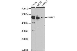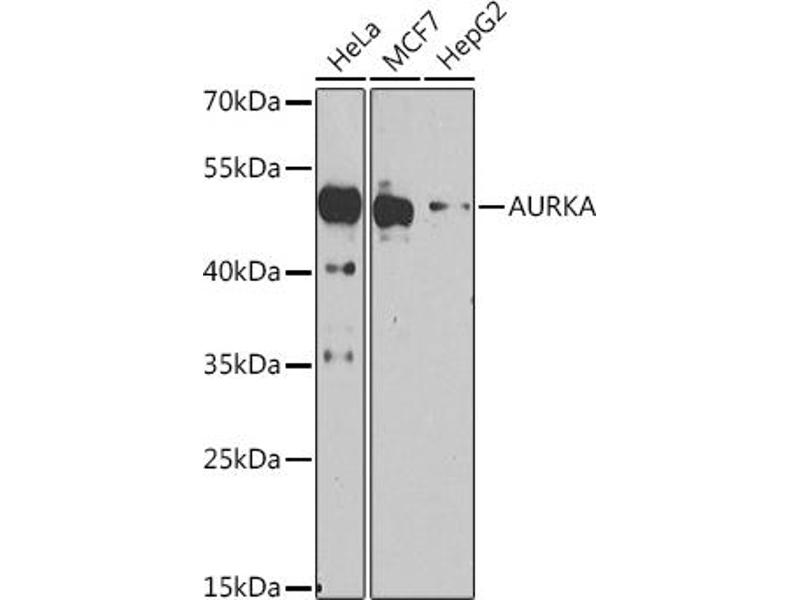 The protein encoded by this gene is a cell cycle-regulated kinase that appears to be involved in microtubule formation and/or stabilization at the spindle pole during chromosome segregation. The encoded protein is found at the centrosome in interphase cells and at the spindle poles in mitosis. This gene may play a role in tumor development and progression. A processed pseudogene of this gene has been found on chromosome 1, and an unprocessed pseudogene has been found on chromosome 10. Multiple transcript variants encoding the same protein have been found for this gene.,AURKA,AIK,ARK1,AURA,BTAK,PPP1R47,STK15,STK6,STK7,Epigenetics & Nuclear Signaling,Cancer,Tumor biomarkers,Signal Transduction,Kinase,Serine/threonine kinases,Cell Biology & Developmental Biology,Cell Cycle,Centrosome,G2/M DNA Damage Checkpoint,AURKA