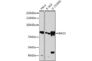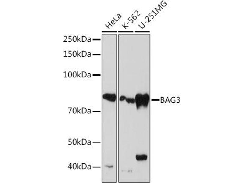 BAG proteins compete with Hip for binding to the Hsc70/Hsp70 ATPase domain and promote substrate release. All the BAG proteins have an approximately 45-amino acid BAG domain near the C terminus but differ markedly in their N-terminal regions. The protein encoded by this gene contains a WW domain in the N-terminal region and a BAG domain in the C-terminal region. The BAG domains of BAG1, BAG2, and BAG3 interact specifically with the Hsc70 ATPase domain in vitro and in mammalian cells. All 3 proteins bind with high affinity to the ATPase domain of Hsc70 and inhibit its chaperone activity in a Hip-repressible manner. [provided by RefSeq, Jul 2008],BAG-3, BIS, CAIR-1, MFM6,Apoptosis,Apoptosis_Bcl 2 family,Cancer,Cell Biology & Developmental Biology,Endocrine & Metabolism,Invasion and Metastasis,BAG3