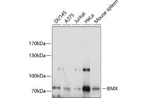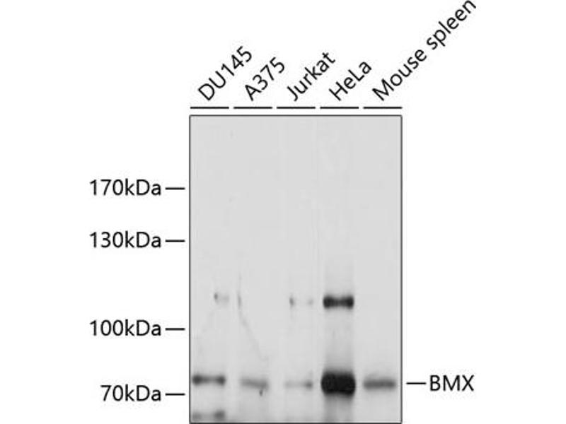 This gene encodes a non-receptor tyrosine kinase belonging to the Tec kinase family. The protein contains a PH-like domain, which mediates membrane targeting by binding to phosphatidylinositol 3,4,5-triphosphate (PIP3), and a SH2 domain that binds to tyrosine-phosphorylated proteins and functions in signal transduction. The protein is implicated in several signal transduction pathways including the Stat pathway, and regulates differentiation and tumorigenicity of several types of cancer cells. Alternatively spliced transcript variants have been found for this gene.,BMX,ETK,PSCTK2,PSCTK3,Signal Transduction,Kinase,Tyrosine kinases,Cell Biology & Developmental Biology,Apoptosis,Wnt/β-Catenin Signaling Pathway,BMX