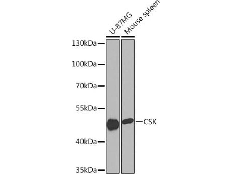 Non-receptor tyrosine-protein kinase that plays an important role in the regulation of cell growth, differentiation, migration and immune response. Phosphorylates tyrosine residues located in the C-terminal tails of Src-family kinases (SFKs including LCK, SRC, HCK, FYN, LYN, CSK or YES1. Upon tail phosphorylation, Src-family members engage in intramolecular interactions between the phosphotyrosine tail and the SH2 domain that result in an inactive conformation. To inhibit SFKs, CSK is recruited to the plasma membrane via binding to transmembrane proteins or adapter proteins located near the plasma membrane. Suppresses signaling by various surface receptors, including T-cell receptor (TCR and B-cell receptor (BCR by phosphorylating and maintaining inactive several positive effectors such as FYN or LCK.,CSK,Signal Transduction,Kinase,Tyrosine kinases,Immunology & Inflammation,B Cell Receptor Signaling Pathway,CSK