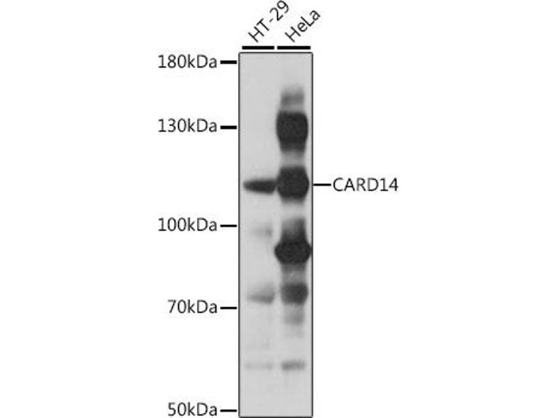 This gene encodes a caspase recruitment domain-containing protein that is a member of the membrane-associated guanylate kinase (MAGUK) family of proteins. Members of this protein family are scaffold proteins that are involved in a diverse array of cellular processes including cellular adhesion, signal transduction and cell polarity control. This protein has been shown to specifically interact with BCL10, a protein known to function as a positive regulator of cell apoptosis and NF-kappaB activation. Alternate splicing results in multiple transcript variants.,CARD14,BIMP2,CARMA2,PRP,PSORS2,PSS1,Cell Biology & Developmental Biology,Apoptosis,Caspases,CARD14