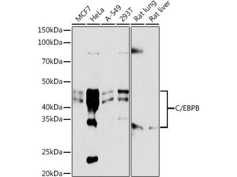 This intronless gene encodes a transcription factor that contains a basic leucine zipper (bZIP) domain. The encoded protein functions as a homodimer but can also form heterodimers with CCAAT/enhancer-binding proteins alpha, delta, and gamma. Activity of this protein is important in the regulation of genes involved in immune and inflammatory responses, among other processes. The use of alternative in-frame AUG start codons results in multiple protein isoforms, each with distinct biological functions. [provided by RefSeq, Oct 2013],C/EBP-beta,IL6DBP,NF-IL6,TCF5,CEBP beta,CEBPB,Apoptosis,Cardiovascular,Cell Adhesion,Cell Biology & Developmental Biology,Endocrine & Metabolism,Endocrine and metabolic diseases,Endocrine and metabolic diseases_Diabetes,Epigenetics & Nuclear Signaling,Heart,Heart_Hypertrophy,IL-6 Receptor Signaling Pathway,Immunology & Inflammation,MAPK-Erk Signaling Pathway,Protein phosphorylation,Signal Transduction,Transcription Factors,Wnt/β-Catenin Signaling Pathway,CEBPB
