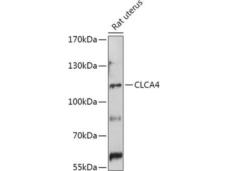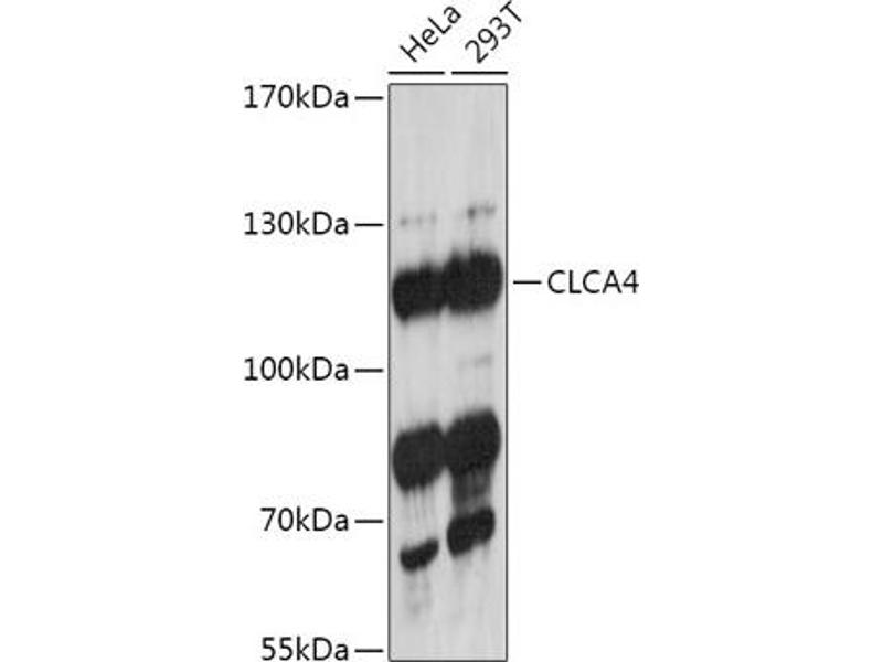The protein encoded by this gene belongs to the calcium sensitive chloride conductance protein family. To date, all members of this gene family map to the same site on chromosome 1p31-p22 and share high degrees of homology in size, sequence and predicted structure, but differ significantly in their tissue distributions. Alternative splicing results in multiple transcript variants, only one of which is thought to be protein coding. [provided by RefSeq, Dec 2008],CaCC,CaCC2,CLCA4,Signal Transduction,Endocrine & Metabolism,CLCA4