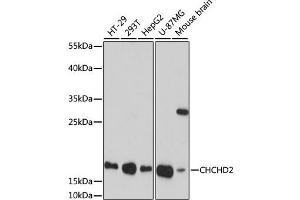 The protein encoded by this gene belongs to a class of eukaryotic CX(9)C proteins characterized by four cysteine residues spaced ten amino acids apart from one another. These residues form disulfide linkages that define a CHCH fold. In response to stress, the protein translocates from the mitochondrial intermembrane space to the nucleus where it binds to a highly conserved 13 nucleotide oxygen responsive element in the promoter of cytochrome oxidase 4I2, a subunit of the terminal enzyme of the electron transport chain. In concert with recombination signal sequence-binding protein J, binding of this protein activates the oxygen responsive element at four percent oxygen. In addition, it has been shown that this protein is a negative regulator of mitochondria-mediated apoptosis. In response to apoptotic stimuli, mitochondrial levels of this protein decrease, allowing BCL2-associated X protein to oligomerize and activate the caspase cascade. Pseudogenes of this gene are found on multiple chromosomes. Alternative splicing results in multiple transcript variants.,CHCHD2,C7orf17,MNRR1,NS2TP,PARK22,Cell Biology & Developmental Biology,CHCHD2