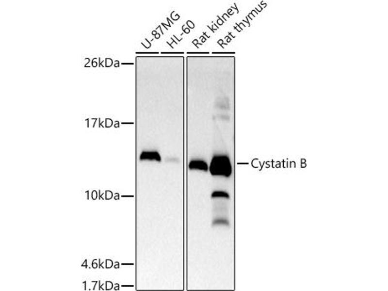 The cystatin superfamily encompasses proteins that contain multiple cystatin-like sequences. Some of the members are active cysteine protease inhibitors, while others have lost or perhaps never acquired this inhibitory activity. There are three inhibitory families in the superfamily, including the type 1 cystatins (stefins), type 2 cystatins and kininogens. This gene encodes a stefin that functions as an intracellular thiol protease inhibitor. The protein is able to form a dimer stabilized by noncovalent forces, inhibiting papain and cathepsins l, h and b. The protein is thought to play a role in protecting against the proteases leaking from lysosomes. Evidence indicates that mutations in this gene are responsible for the primary defects in patients with progressive myoclonic epilepsy (EPM1). One type of mutation responsible for EPM1 is the expansion in the promoter region of this gene of a CCCCGCCCCGCG repeat from 2-3 copies to 30-78 copies.,CSTB,CPI-B,CST6,EPM1,EPM1A,PME,STFB,ULD,Epigenetics & Nuclear Signaling,RNA Binding,Cell Biology & Developmental Biology,Ubiquitin,Cystatin B
