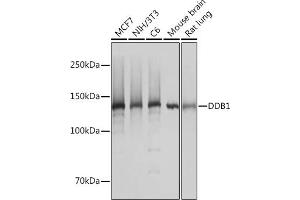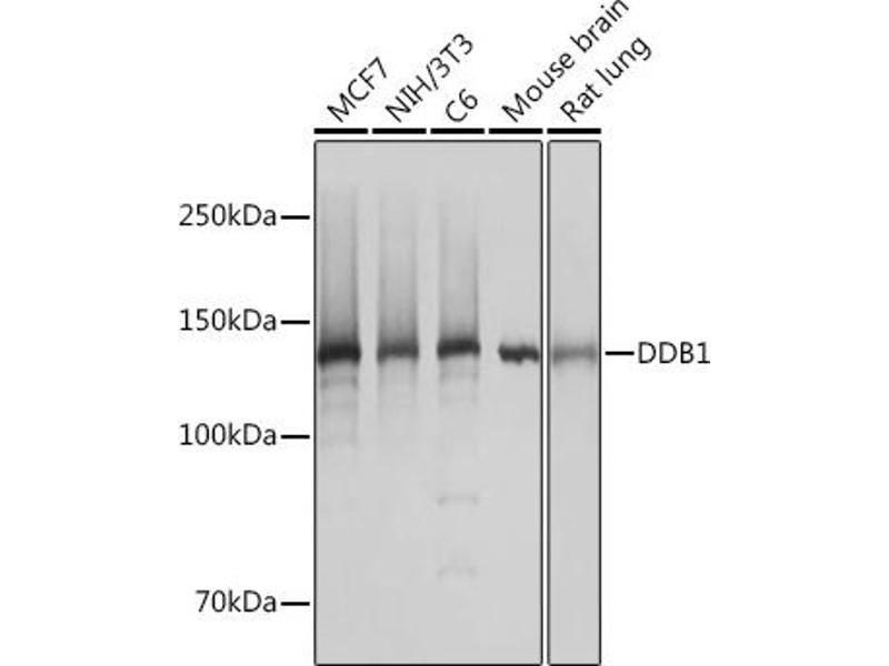 The protein encoded by this gene is the large subunit (p127) of the heterodimeric DNA damage-binding (DDB) complex while another protein (p48) forms the small subunit. This protein complex functions in nucleotide-excision repair and binds to DNA following UV damage. Defective activity of this complex causes the repair defect in patients with xeroderma pigmentosum complementation group E (XPE) - an autosomal recessive disorder characterized by photosensitivity and early onset of carcinomas. However, it remains for mutation analysis to demonstrate whether the defect in XPE patients is in this gene or the gene encoding the small subunit. In addition, Best vitelliform mascular dystrophy is mapped to the same region as this gene on 11q, but no sequence alternations of this gene are demonstrated in Best disease patients. The protein encoded by this gene also functions as an adaptor molecule for the cullin 4 (CUL4) ubiquitin E3 ligase complex by facilitating the binding of substrates to this complex and the ubiquitination of proteins. [provided by RefSeq, May 2012],DDBA, UV-DDB1, XAP1, XPCE, XPE, XPE-BF,Cancer,Carbohydrate metabolism,Cell Biology & Developmental Biology,DNA Damage & Repair,Endocrine & Metabolism,Epigenetics & Nuclear Signaling,Neurodegenerative Diseases,Neurodegenerative Diseases_Amyloid Plaque and Neurofibrillary Tangle Formation in Alzheimers Disease,Neuroscience,Signal Transduction,Ubiquitin,Ubiquitin_Ubiquitin-Proteasome Signaling Pathway,DDB1