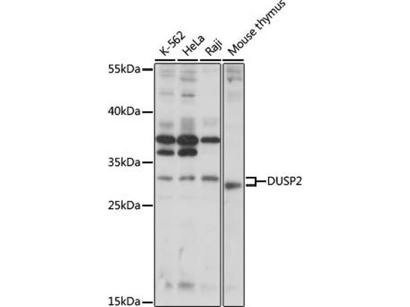 The protein encoded by this gene is a member of the dual specificity protein phosphatase subfamily. These phosphatases inactivate their target kinases by dephosphorylating both the phosphoserine/threonine and phosphotyrosine residues. They negatively regulate members of the mitogen-activated protein (MAP) kinase superfamily (MAPK/ERK, SAPK/JNK, p38), which are associated with cellular proliferation and differentiation. Different members of the family of dual specificity phosphatases show distinct substrate specificities for various MAP kinases, different tissue distribution and subcellular localization, and different modes of inducibility of their expression by extracellular stimuli. This gene product inactivates ERK1 and ERK2, is predominantly expressed in hematopoietic tissues, and is localized in the nucleus.,DUSP2,PAC-1,PAC1,Epigenetics & Nuclear Signaling,Cancer,Tumor suppressors,p53 pathway,Signal Transduction,Cell Biology & Developmental Biology,Apoptosis,Cell Cycle,Endocrine & Metabolism,DUSP2