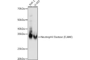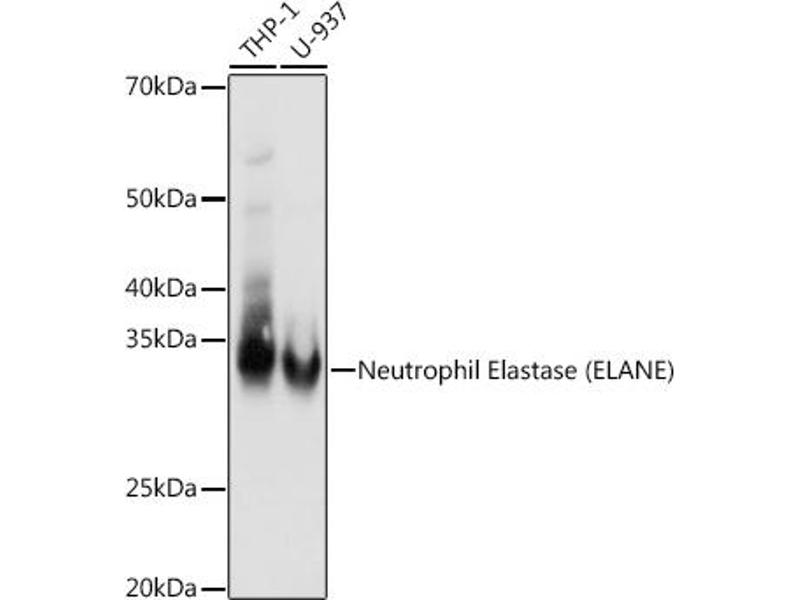 Elastases form a subfamily of serine proteases that hydrolyze many proteins in addition to elastin. Humans have six elastase genes which encode structurally similar proteins. The encoded preproprotein is proteolytically processed to generate the active protease. Following activation, this protease hydrolyzes proteins within specialized neutrophil lysosomes, called azurophil granules, as well as proteins of the extracellular matrix. The enzyme may play a role in degenerative and inflammatory diseases through proteolysis of collagen-IV and elastin. This protein also degrades the outer membrane protein A (OmpA) of E. coli as well as the virulence factors of such bacteria as Shigella, Salmonella and Yersinia. Mutations in this gene are associated with cyclic neutropenia and severe congenital neutropenia (SCN). This gene is present in a gene cluster on chromosome 19. [provided by RefSeq, Jan 2016],ELA2, GE, HLE, HNE, NE, PMN-E, SCN1,Cell Biology & Developmental Biology,Cytoskeleton,Extracellular Matrix,Signal Transduction,ELANE