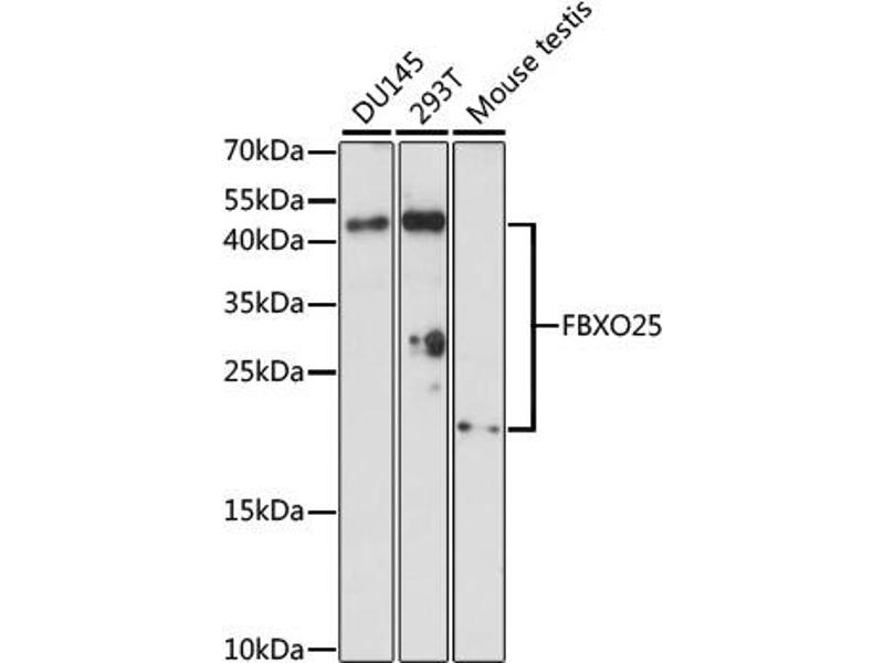 - This gene encodes a member of the F-box protein family which is characterized by an approximately 40 amino acid motif, the F-box. The F-box proteins constitute one of the four subunits of ubiquitin protein ligase complex called SCFs (SKP1-cullin-F-box), which function in phosphorylation-dependent ubiquitination. The F-box proteins are divided into 3 classes: Fbws containing WD-40 domains, Fbls containing leucine-rich repeats, and Fbxs containing either different protein-protein interaction modules or no recognizable motifs. The protein encoded by this gene belongs to the Fbxs class. Three alternatively spliced transcript variants encoding distinct isoforms have been found for this gene.,FBXO25,FBX25,Epigenetics & Nuclear Signaling,Cell Biology & Developmental Biology,Cell Cycle,Ubiquitin,FBXO25