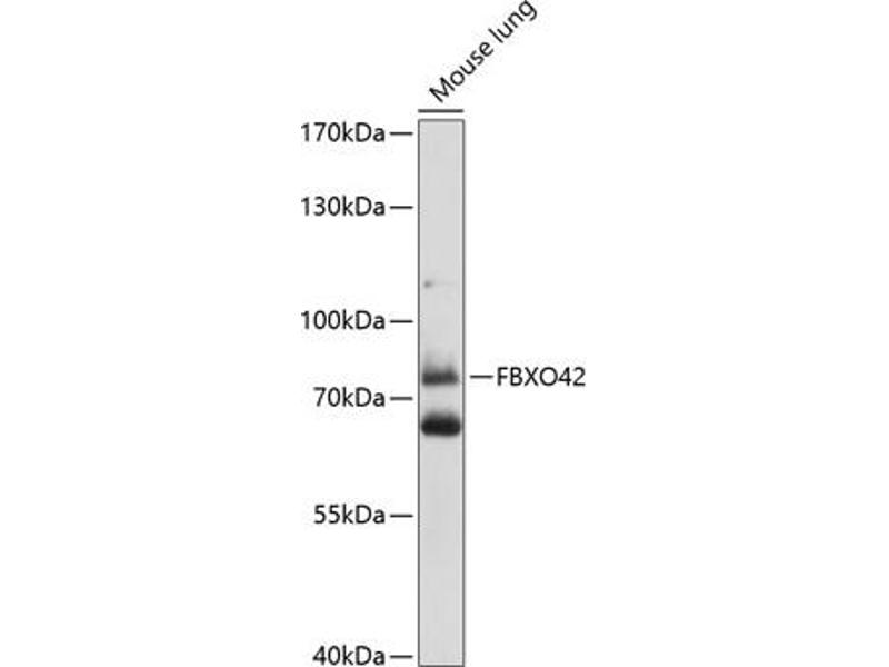 Members of the F-box protein family, such as FBXO42, are characterized by an approximately 40-amino acid F-box motif. SCF complexes, formed by SKP1 (SKP1A, MIM 601434), cullin (see CUL1, MIM 603134), and F-box proteins, act as protein-ubiquitin ligases. F-box proteins interact with SKP1 through the F box, and they interact with ubiquitination targets through other protein interaction domains (Jin et al., 2004 [PubMed 15520277]).[supplied by OMIM, Dec 2010],FBXO42,Fbx42,JFK,Epigenetics & Nuclear Signaling,Cell Biology & Developmental Biology,Ubiquitin,FBXO42