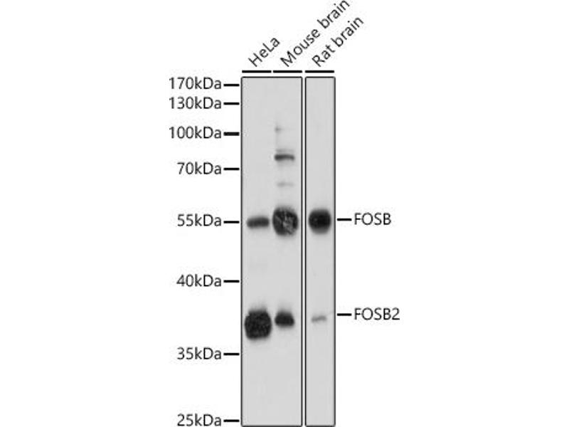 The Fos gene family consists of 4 members: FOS, FOSB, FOSL1, and FOSL2. These genes encode leucine zipper proteins that can dimerize with proteins of the JUN family, thereby forming the transcription factor complex AP-1. As such, the FOS proteins have been implicated as regulators of cell proliferation, differentiation, and transformation. Alternatively spliced transcript variants encoding different isoforms have been found for this gene.,FOSB,AP-1,G0S3,GOS3,GOSB,Epigenetics & Nuclear Signaling,Transcription Factors,Cancer,FOSB