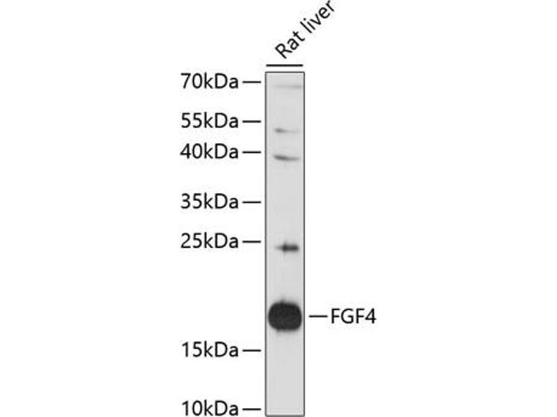 The protein encoded by this gene is a member of the fibroblast growth factor (FGF) family. FGF family members possess broad mitogenic and cell survival activities and are involved in a variety of biological processes including embryonic development, cell growth, morphogenesis, tissue repair, tumor growth and invasion. This gene was identified by its oncogenic transforming activity. This gene and FGF3, another oncogenic growth factor, are located closely on chromosome 11. Co-amplification of both genes was found in various kinds of human tumors. Studies on the mouse homolog suggested a function in bone morphogenesis and limb development through the sonic hedgehog (SHH) signaling pathway.,FGF4,HBGF-4,HST,HST-1,HSTF1,K-FGF,KFGF,Cancer,Signal Transduction,Cell Biology & Developmental Biology,Apoptosis,Growth factor,Stem Cells,Cardiovascular,Angiogenesis,FGF4