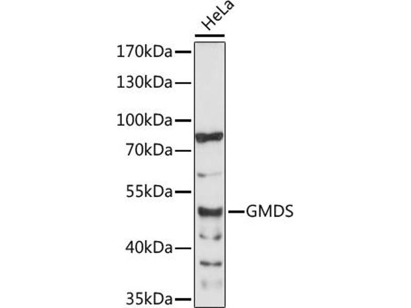 GDP-mannose 4,6-dehydratase (GMD, EC 4.2.1.47) catalyzes the conversion of GDP-mannose to GDP-4-keto-6-deoxymannose, the first step in the synthesis of GDP-fucose from GDP-mannose, using NADP+ as a cofactor. The second and third steps of the pathway are catalyzed by a single enzyme, GDP-keto-6-deoxymannose 3,5-epimerase, 4-reductase, designated FX in humans (MIM 137020).,GMDS,GMD,SDR3E1,GDP-mannose 4,Cancer,Signal Transduction,Endocrine & Metabolism,GMDS