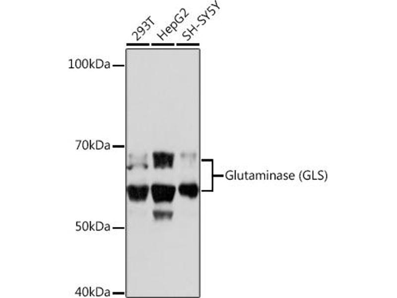 This gene encodes the K-type mitochondrial glutaminase. The encoded protein is an phosphate-activated amidohydrolase that catalyzes the hydrolysis of glutamine to glutamate and ammonia. This protein is primarily expressed in the brain and kidney plays an essential role in generating energy for metabolism, synthesizing the brain neurotransmitter glutamate and maintaining acid-base balance in the kidney. Alternate splicing results in multiple transcript variants. [provided by RefSeq, Jan 2012],AAD20, GAC, GAM, GLS1, KGA,Amino acid metabolism,Cancer,Cell Type Marker,Cell Type Marker_Neuron marker,Endocrine & Metabolism,Neuroscience,Signal Transduction,Warburg Effect,GLS