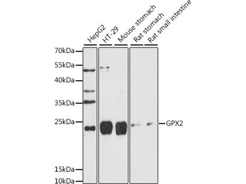 The protein encoded by this gene belongs to the glutathione peroxidase family, members of which catalyze the reduction of organic hydroperoxides and hydrogen peroxide (H2O2) by glutathione, and thereby protect cells against oxidative damage. Several isozymes of this gene family exist in vertebrates, which vary in cellular location and substrate specificity. This isozyme is predominantly expressed in the gastrointestinal tract (also in liver in human), is localized in the cytoplasm, and whose preferred substrate is hydrogen peroxide. Overexpression of this gene is associated with increased differentiation and proliferation in colorectal cancer. This isozyme is also a selenoprotein, containing the rare amino acid selenocysteine (Sec) at its active site. Sec is encoded by the UGA codon, which normally signals translation termination. The 3' UTRs of selenoprotein mRNAs contain a conserved stem-loop structure, designated the Sec insertion sequence (SECIS) element, that is necessary for the recognition of UGA as a Sec codon, rather than as a stop signal. Alternatively spliced transcript variants have been found for this gene.,GPX2;GI-GPx;GPRP;GPRP-2;GPx-2;GPx-GI;GSHPX-GI;GSHPx-2,Cell Biology & Developmental Biology,Endocrine & Metabolism,GPX2