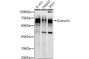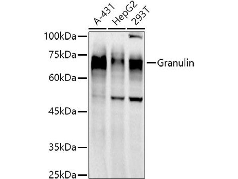Granulins are a family of secreted, glycosylated peptides that are cleaved from a single precursor protein with 7.5 repeats of a highly conserved 12-cysteine granulin/epithelin motif. The 88 kDa precursor protein, progranulin, is also called proepithelin and PC cell-derived growth factor. Cleavage of the signal peptide produces mature granulin which can be further cleaved into a variety of active, 6 kDa peptides. These smaller cleavage products are named granulin A, granulin B, granulin C, etc. Epithelins 1 and 2 are synonymous with granulins A and B, respectively. Both the peptides and intact granulin protein regulate cell growth. However, different members of the granulin protein family may act as inhibitors, stimulators, or have dual actions on cell growth. Granulin family members are important in normal development, wound healing, and tumorigenesis. [provided by RefSeq, Jul 2008],CLN11, GEP, GP88, PCDGF, PEPI, PGRN,Cancer,Cell Biology & Developmental Biology,Cytokines,Epigenetics & Nuclear Signaling,Growth factors,Immunology & Inflammation,Neurodegenerative Diseases,Neuroscience,RNA Binding,Signal Transduction,GRN
