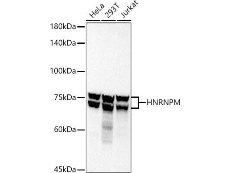 This gene belongs to the subfamily of ubiquitously expressed heterogeneous nuclear ribonucleoproteins (hnRNPs). The hnRNPs are RNA binding proteins and they complex with heterogeneous nuclear RNA (hnRNA). These proteins are associated with pre-mRNAs in the nucleus and appear to influence pre-mRNA processing and other aspects of mRNA metabolism and transport. While all of the hnRNPs are present in the nucleus, some seem to shuttle between the nucleus and the cytoplasm. The hnRNP proteins have distinct nucleic acid binding properties. The protein encoded by this gene has three repeats of quasi-RRM domains that bind to RNAs. This protein also constitutes a monomer of the N-acetylglucosamine-specific receptor which is postulated to trigger selective recycling of immature GlcNAc-bearing thyroglobulin molecules. Alternative splicing results in multiple transcript variants.,HNRNPM,CEAR,HNRNPM4,HNRPM,HNRPM4,HTGR1,NAGR1,hnRNP M,hnRNPM,Epigenetics & Nuclear Signaling,RNA Binding,HNRNPM