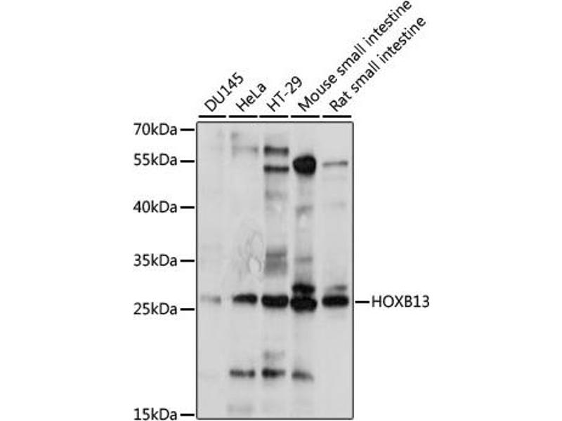 This gene encodes a transcription factor that belongs to the homeobox gene family. Genes of this family are highly conserved among vertebrates and essential for vertebrate embryonic development. This gene has been implicated to play a role in fetal skin development and cutaneous regeneration. In mice, a similar gene was shown to exhibit temporal and spatial colinearity in the main body axis of the embryo, but was not expressed in the secondary axes, which suggests functions in body patterning along the axis. This gene and other HOXB genes form a gene cluster at chromosome the 17q21-22 region.,HOXB13,PSGD,Epigenetics & Nuclear Signaling,Transcription Factors,Nuclear Receptor Signaling,Cancer,Tumor biomarkers,Tumor suppressors,HOXB13