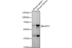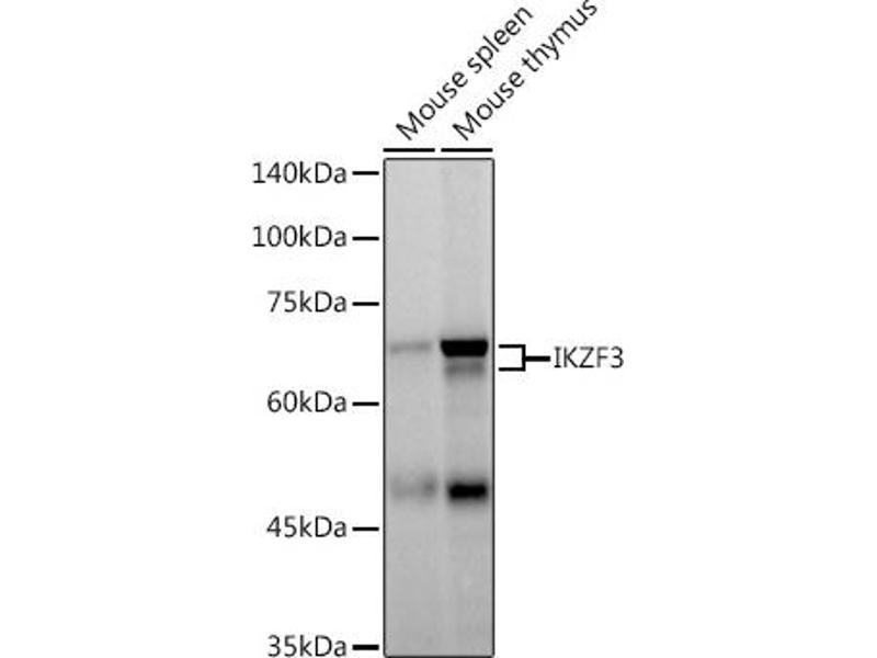 This gene encodes a member of the Ikaros family of zinc-finger proteins. Three members of this protein family (Ikaros, Aiolos and Helios) are hematopoietic-specific transcription factors involved in the regulation of lymphocyte development. This gene product is a transcription factor that is important in the regulation of B lymphocyte proliferation and differentiation. Both Ikaros and Aiolos can participate in chromatin remodeling. Regulation of gene expression in B lymphocytes by Aiolos is complex as it appears to require the sequential formation of Ikaros homodimers, Ikaros/Aiolos heterodimers, and Aiolos homodimers. Several alternative transcripts encoding different isoforms have been described, as well as some non-protein coding variants. [provided by RefSeq, Apr 2012],AIO, AIOLOS, ZNFN1A3,Epigenetics & Nuclear Signaling,Transcription Factors,IKZF3