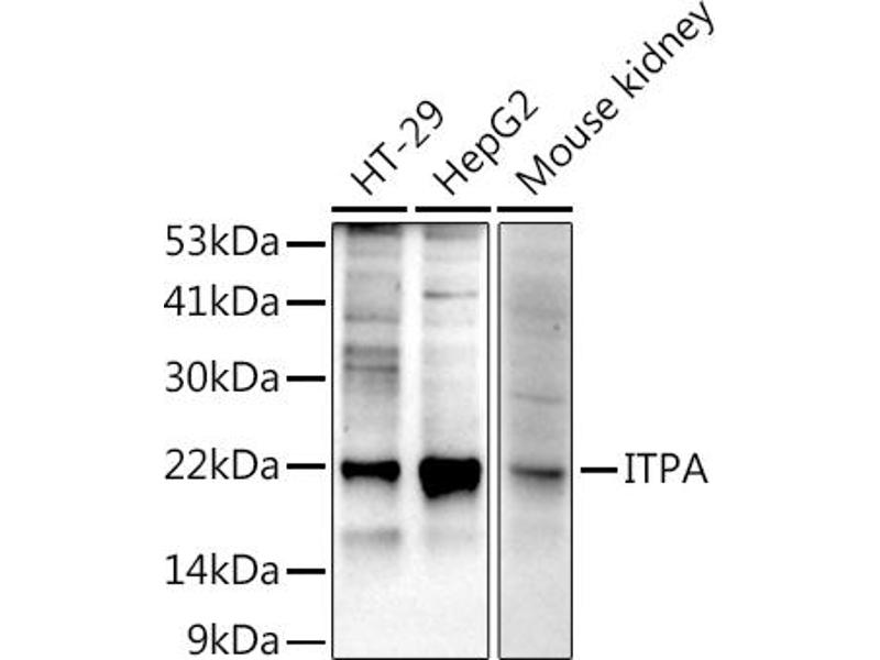 This gene encodes an inosine triphosphate pyrophosphohydrolase. The encoded protein hydrolyzes inosine triphosphate and deoxyinosine triphosphate to the monophosphate nucleotide and diphosphate. This protein, which is a member of the HAM1 NTPase protein family, is found in the cytoplasm and acts as a homodimer. Defects in the encoded protein can result in inosine triphosphate pyrophosphorylase deficiency which causes an accumulation of ITP in red blood cells. Alternate splicing results in multiple transcript variants.,ITPA, C20orf37, HLC14-06-P, ITPase, My049, NTPase, dJ794I6.3, inosine triphosphatase,Signal Transduction,Endocrine & Metabolism,Amino acid metabolism,ITPA