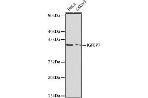 This gene encodes a member of the insulin-like growth factor (IGF)-binding protein (IGFBP) family. IGFBPs bind IGFs with high affinity, and regulate IGF availability in body fluids and tissues and modulate IGF binding to its receptors. This protein binds IGF-I and IGF-II with relatively low affinity, and belongs to a subfamily of low-affinity IGFBPs. It also stimulates prostacyclin production and cell adhesion. Alternatively spliced transcript variants encoding different isoforms have been described for this gene, and one variant has been associated with retinal arterial macroaneurysm (PMID:21835307). [provided by RefSeq, Dec 2011],AGM, FSTL2, IBP-7, IGFBP-7, IGFBP-7v, IGFBPRP1, MAC25, PSF, RAMSVPS, TAF,Cancer,Cell Biology & Developmental Biology,Growth factors,Signal Transduction,Tumor suppressors,IGFBP7