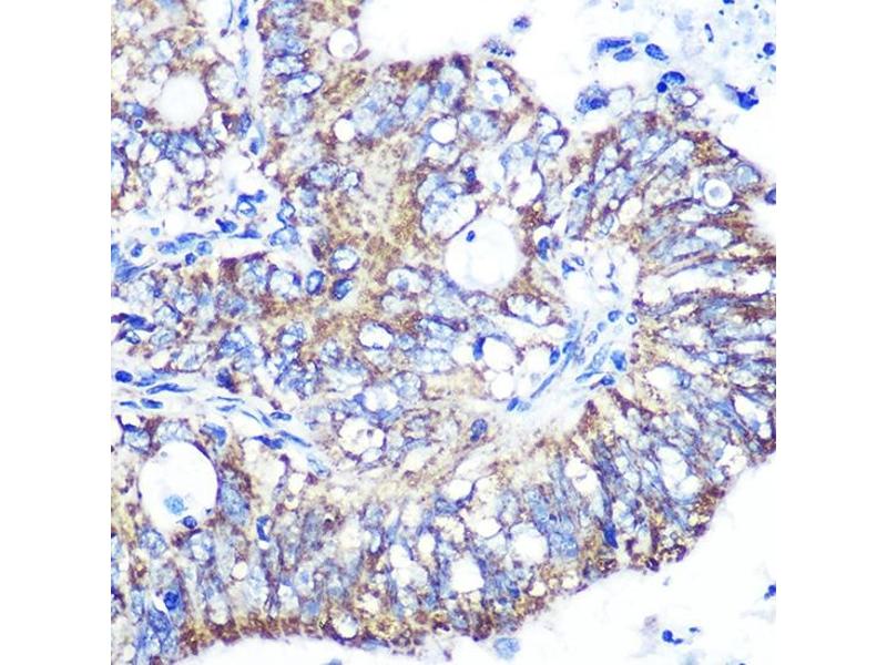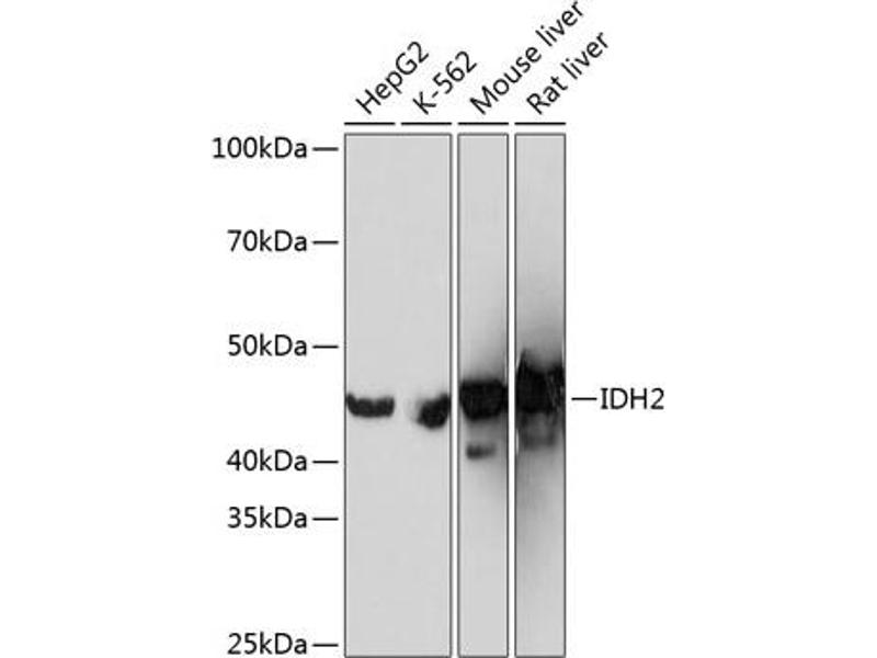 Isocitrate dehydrogenases catalyze the oxidative decarboxylation of isocitrate to 2-oxoglutarate. These enzymes belong to two distinct subclasses, one of which utilizes NAD(+) as the electron acceptor and the other NADP(+). Five isocitrate dehydrogenases have been reported: three NAD(+)-dependent isocitrate dehydrogenases, which localize to the mitochondrial matrix, and two NADP(+)-dependent isocitrate dehydrogenases, one of which is mitochondrial and the other predominantly cytosolic. Each NADP(+)-dependent isozyme is a homodimer. The protein encoded by this gene is the NADP(+)-dependent isocitrate dehydrogenase found in the mitochondria. It plays a role in intermediary metabolism and energy production. This protein may tightly associate or interact with the pyruvate dehydrogenase complex. Alternative splicing results in multiple transcript variants. [provided by RefSeq, Feb 2014],D2HGA2, ICD-M, IDH, IDHM, IDP, IDPM, mNADP-IDH,Cancer,Endocrine & Metabolism,Epigenetics & Nuclear Signaling,Mitochondrial metabolism,Mitochondrial metabolism_Mitochondrial markers,Signal Transduction,IDH2