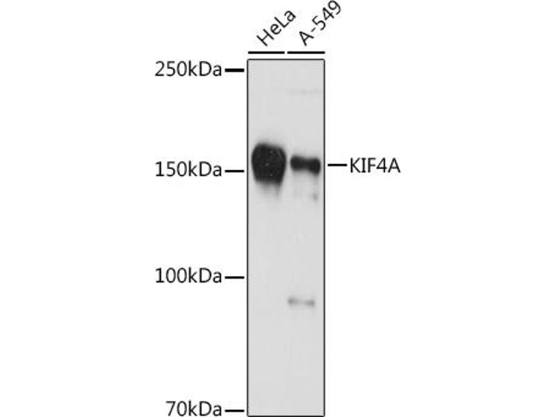 This gene encodes a member of the kinesin 4 subfamily of kinesin related proteins. The encoded protein is an ATP dependent microtubule-based motor protein that is involved in the intracellular transport of membranous organelles. This protein also associates with condensed chromosome arms and may be involved in maintaining chromosome integrity during mitosis. This protein may also be involved in the organization of the central spindle prior to cytokinesis. A pseudogene of this gene is found on chromosome X.[provided by RefSeq, Mar 2010],KIF4, KIF4G1, MRX100,Apoptosis,Cell Biology & Developmental Biology,Cell Cycle,Cytoskeleton,Cytoskeleton_Motor Proteins,Epigenetics & Nuclear Signaling,Signal Transduction,KIF4A