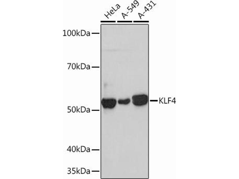 - This gene encodes a protein that belongs to the Kruppel family of transcription factors. The encoded zinc finger protein is required for normal development of the barrier function of skin. The encoded protein is thought to control the G1-to-S transition of the cell cycle following DNA damage by mediating the tumor suppressor gene p53. Mice lacking this gene have a normal appearance but lose weight rapidly, and die shortly after birth due to fluid evaporation resulting from compromised epidermal barrier function. Alternative splicing results in multiple transcript variants encoding different isoforms. [provided by RefSeq, Sep 2015],EZF, GKLF,Cancer,Cardiovascular,Cell Biology & Developmental Biology,Cell Cycle,Cell Cycle_Cell cycle inhibitors,Cell Cycle_Cell differentiation,Embryonic Stem Cells,Epigenetics & Nuclear Signaling,Heart,Heart_Hypertrophy,Stem Cells,Transcription Factors,Tumor suppressors,KLF4