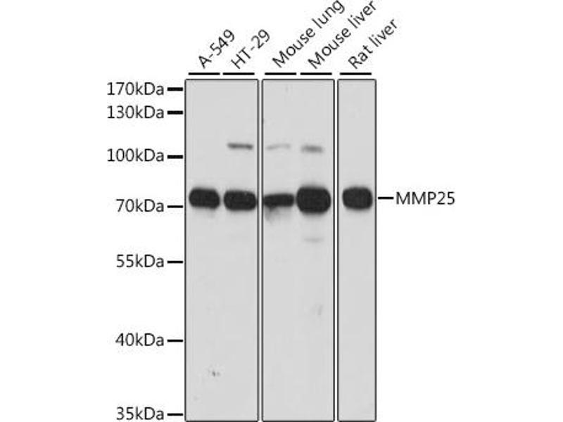 Proteins of the matrix metalloproteinase (MMP) family are involved in the breakdown of extracellular matrix in normal physiological processes, such as embryonic development, reproduction, and tissue remodeling, as well as in disease processes, such as arthritis and metastasis. Most MMPs are secreted as inactive proproteins which are activated when cleaved by extracellular proteinases. However, the protein encoded by this gene is a member of the membrane-type MMP (MT-MMP) subfamily, attached to the plasma membrane via a glycosylphosphatidyl inositol anchor. In response to bacterial infection or inflammation, the encoded protein is thought to inactivate alpha-1 proteinase inhibitor, a major tissue protectant against proteolytic enzymes released by activated neutrophils, facilitating the transendothelial migration of neutrophils to inflammatory sites. The encoded protein may also play a role in tumor invasion and metastasis through activation of MMP2. The gene has previously been referred to as MMP20 but has been renamed MMP25.,MMP25,MMP-25,MMP20,MMP20A,MMPL1,MT-MMP 6,MT-MMP6,MT6-MMP,MT6MMP,MTMMP6,Cancer,Invasion and Metastasis,Signal Transduction,Cell Biology & Developmental Biology,Cytoskeleton,Extracellular Matrix,MMPs,Ubiquitin,MMP25