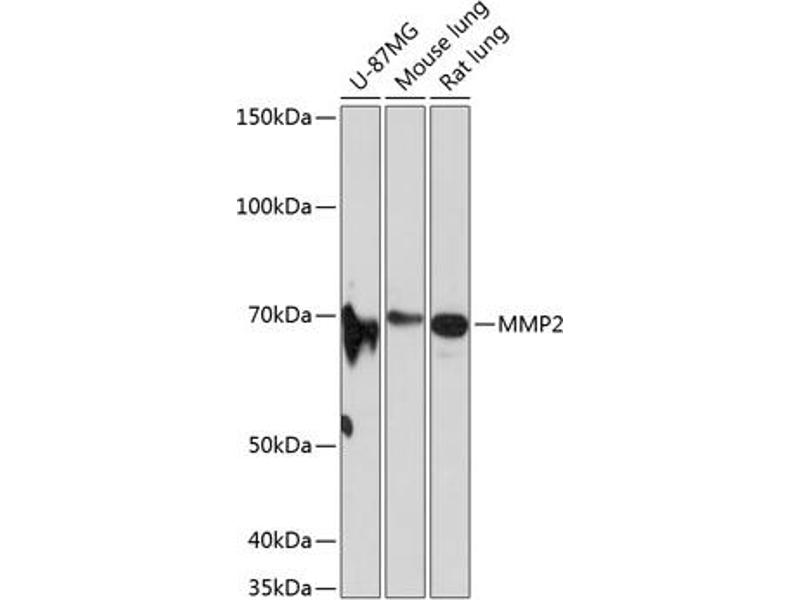 This gene is a member of the matrix metalloproteinase (MMP) gene family, that are zinc-dependent enzymes capable of cleaving components of the extracellular matrix and molecules involved in signal transduction. The protein encoded by this gene is a gelatinase A, type IV collagenase, that contains three fibronectin type II repeats in its catalytic site that allow binding of denatured type IV and V collagen and elastin. Unlike most MMP family members, activation of this protein can occur on the cell membrane. This enzyme can be activated extracellularly by proteases, or, intracellulary by its S-glutathiolation with no requirement for proteolytical removal of the pro-domain. This protein is thought to be involved in multiple pathways including roles in the nervous system, endometrial menstrual breakdown, regulation of vascularization, and metastasis. Mutations in this gene have been associated with Winchester syndrome and Nodulosis-Arthropathy-Osteolysis (NAO) syndrome. Alternative splicing results in multiple transcript variants encoding different isoforms. [provided by RefSeq, Oct 2014],CLG4,CLG4A,MMP-2,MMP-II,MONA,TBE-1,MMP2,Angiogenesis,Cancer,Cardiovascular,Cell Biology & Developmental Biology,Endocrine & Metabolism,Extracellular Matrix,Extracellular Matrix_MMPs,G protein signaling,G protein signaling_G-Protein-Coupled Receptors Signaling to MAPK/Erk,Hypoxia,Invasion and Metastasis,Signal Transduction,Tumor biomarkers,Ubiquitin,MMP2