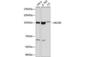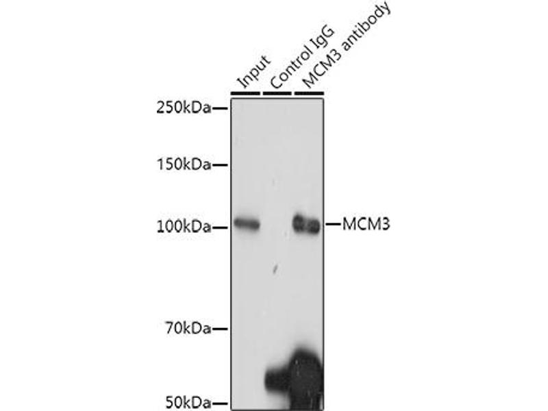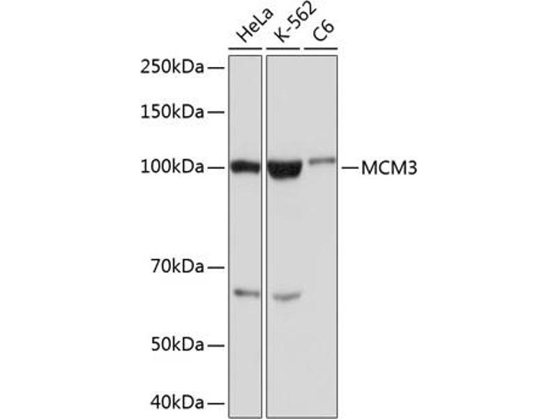 The protein encoded by this gene is one of the highly conserved mini-chromosome maintenance proteins (MCM) that are involved in the initiation of eukaryotic genome replication. The hexameric protein complex formed by MCM proteins is a key component of the pre-replication complex (pre_RC) and may be involved in the formation of replication forks and in the recruitment of other DNA replication related proteins. This protein is a subunit of the protein complex that consists of MCM2-7. It has been shown to interact directly with MCM5/CDC46. This protein also interacts with and is acetylated by MCM3AP, a chromatin-associated acetyltransferase. The acetylation of this protein inhibits the initiation of DNA replication and cell cycle progression. Two transcript variants encoding different isoforms have been found for this gene. [provided by RefSeq, Jul 2012],HCC5, P1-MCM3, P1.h, RLFB,Cell Biology & Developmental Biology,Cell Cycle,Cell Cycle_Centrosome,Epigenetics & Nuclear Signaling,MCM3
