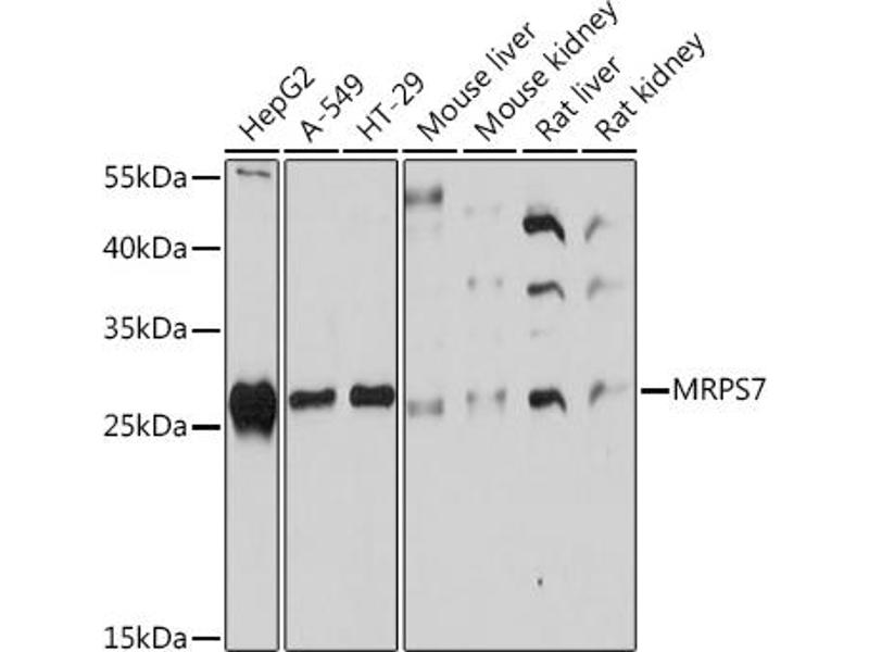 Mammalian mitochondrial ribosomal proteins are encoded by nuclear genes and help in protein synthesis within the mitochondrion. Mitochondrial ribosomes (mitoribosomes) consist of a small 28S subunit and a large 39S subunit. They have an estimated 75% protein to rRNA composition compared to prokaryotic ribosomes, where this ratio is reversed. Another difference between mammalian mitoribosomes and prokaryotic ribosomes is that the latter contain a 5S rRNA. Among different species, the proteins comprising the mitoribosome differ greatly in sequence, and sometimes in biochemical properties, which prevents easy recognition by sequence homology. This gene encodes a 28S subunit protein. In the prokaryotic ribosome, the comparable protein is thought to play an essential role in organizing the 3' domain of the 16 S rRNA in the vicinity of the P- and A-sites. Pseudogenes corresponding to this gene are found on chromosomes 8p and 12p.,MRPS7;MRP-S;MRP-S7;RP-S7;RPMS7;S7mt;bMRP27a,Epigenetics & Nuclear Signaling,RNA Binding,Endocrine & Metabolism,Mitochondrial metabolism,Mitochondrial markers,Mitochondrial translation,MRPS7