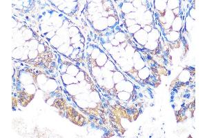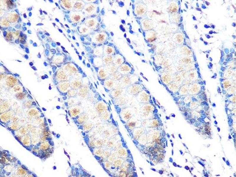 This gene encodes a member of the mucin protein family. Mucins are high molecular weight glycoproteins produced by many epithelial tissues. The protein encoded by this gene is secreted and forms an insoluble mucous barrier that protects the gut lumen. The protein polymerizes into a gel of which 80 % is composed of oligosaccharide side chains by weight. The protein features a central domain containing tandem repeats rich in threonine and proline that varies between 50 and 115 copies in different individuals. Downregulation of this gene has been observed in patients with Crohn disease and ulcerative colitis. [provided by RefSeq, Oct 2016],MLP, MUC-2, SMUC,Cancer,Cell Biology & Developmental Biology,Cytoskeleton,Extracellular Matrix,Immunology & Inflammation,Invasion and Metastasis,Signal Transduction,Tumor immunology,Tumor immunology_Tumor-associated antigens,MUC2
