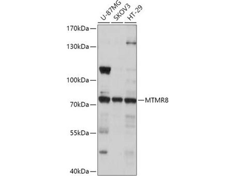 This gene encodes a member of the myotubularin-related family and is part of the MTMR6 subgroup. Family members are dual-specificity phosphatases and the encoded protein contains a phosphoinositide-binding domain (PID) and a SET-interacting domain (SID). Defects in other family members have been found in myotubular myopathic diseases. [provided by RefSeq, Mar 2010],MTMR8,Signal Transduction,Cell Biology & Developmental Biology,Cell Cycle,MTMR8