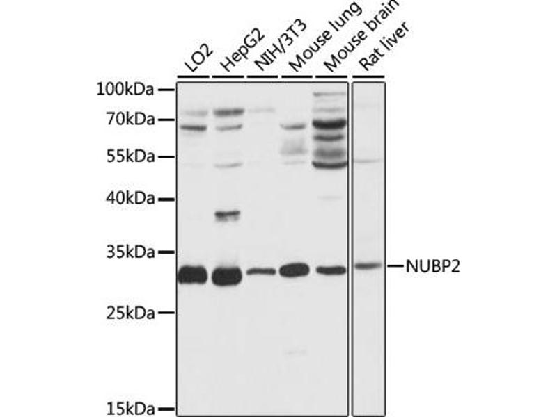 This gene encodes an adenosine triphosphate (ATP) and metal-binding protein that is required for the assembly of cyotosolic iron-sulfur proteins. The encoded protein functions in a heterotetramer with nucleotide-binding protein 1 (NUBP1). Alternative splicing results in multiple transcript variants.,NUBP2,CFD1,NBP 2,NUBP1,Cancer,Signal Transduction,Cell Biology & Developmental Biology,Cell Cycle,Endocrine & Metabolism,NUBP2