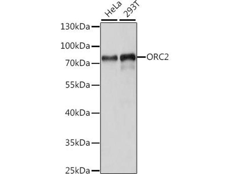 The origin recognition complex (ORC) is a highly conserved six subunits protein complex essential for the initiation of the DNA replication in eukaryotic cells. Studies in yeast demonstrated that ORC binds specifically to origins of replication and serves as a platform for the assembly of additional initiation factors such as Cdc6 and Mcm proteins. The protein encoded by this gene is a subunit of the ORC complex. This protein forms a core complex with ORC3, -4, and -5. It also interacts with CDC45 and MCM10, which are proteins known to be important for the initiation of DNA replication. This protein has been demonstrated to specifically associate with the origin of replication of Epstein-Barr virus in human cells, and is thought to be required for DNA replication from viral origin of replication. Alternatively spliced transcript variants have been found, one of which is a nonsense-mediated mRNA decay candidate.,ORC2,ORC2L,Epigenetics & Nuclear Signaling,Nuclear Receptor Signaling,Cell Biology & Developmental Biology,Cell Cycle,Centrosome,ORC2