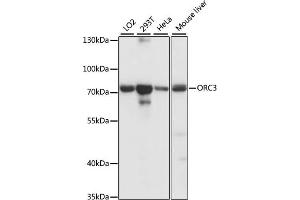 The origin recognition complex (ORC) is a highly conserved six subunits protein complex essential for the initiation of the DNA replication in eukaryotic cells. Studies in yeast demonstrated that ORC binds specifically to origins of replication and serves as a platform for the assembly of additional initiation factors such as Cdc6 and Mcm proteins. The protein encoded by this gene is a subunit of the ORC complex. Studies of a similar gene in Drosophila suggested a possible role of this protein in neuronal proliferation and olfactory memory. Alternatively spliced transcript variants encoding distinct isoforms have been reported for this gene.,ORC3,LAT,LATHEO,ORC3L,Epigenetics & Nuclear Signaling,Cell Biology & Developmental Biology,Cell Cycle,Centrosome,ORC3
