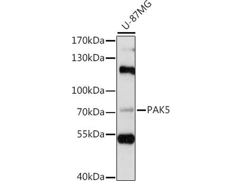 The protein encoded by this gene is a member of the PAK family of Ser/Thr protein kinases. PAK family members are known to be effectors of Rac/Cdc42 GTPases, which have been implicated in the regulation of cytoskeletal dynamics, proliferation, and cell survival signaling. This kinase contains a CDC42/Rac1 interactive binding (CRIB) motif, and has been shown to bind CDC42 in the presence of GTP. This kinase is predominantly expressed in brain. It is capable of promoting neurite outgrowth, and thus may play a role in neurite development. This kinase is associated with microtubule networks and induces microtubule stabilization. The subcellular localization of this kinase is tightly regulated during cell cycle progression. Alternatively spliced transcript variants encoding the same protein have been described.,PAK5,PAK7,Signal Transduction,Kinase,Cell Biology & Developmental Biology,Apoptosis,TGF-b-Smad Signaling Pathway,Neuroscience,PAK5