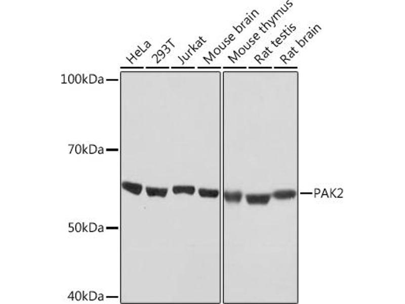 The p21 activated kinases (PAK) are critical effectors that link Rho GTPases to cytoskeleton reorganization and nuclear signaling. The PAK proteins are a family of serine/threonine kinases that serve as targets for the small GTP binding proteins, CDC42 and RAC1, and have been implicated in a wide range of biological activities. The protein encoded by this gene is activated by proteolytic cleavage during caspase-mediated apoptosis, and may play a role in regulating the apoptotic events in the dying cell. [provided by RefSeq, Jul 2008],PAK65, PAKgamma,Apoptosis,Cancer,Cell Biology & Developmental Biology,Cytoskeleton_Microtubules,Immunology & Inflammation,Kinase,Kinase_Serine/threonine kinases,MAPK-Erk Signaling Pathway,Protein phosphorylation,Signal Transduction,TGF-b-Smad Signaling Pathway,PAK2